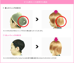 アジャスターを調整し鏡を見ながらウィッグを被ってください。 ウィッグ用のネットなどを利用し髪の毛をまとめたりすると形がよくみえます。 ウィッグの被り方については、こちらをご参照下さい。